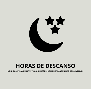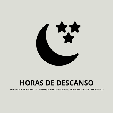 ES Para la comodidad y el disfrute tanto de los huéspedes como de los vecinos, solicitamos que los niveles de ruido se mantengan al mínimo durante las horas de silencio.